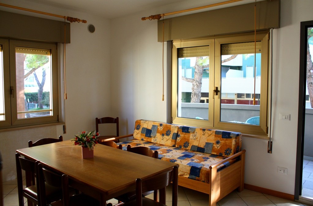 Lignano Sabbiadoro Apartment for 8 persons, distance from the sea: 150 m., distance from the beach: 150 m.. The apartment consists of: living-room with kitchen and single sofa bed, 2 connecting bedrooms with doublebed, 2 bathrooms with shower cubicle, small equipped outdoor area, 1 numbered parking space behind the house or approximately 800 m away. (for small cars. No SUVs and minibuses). Facilities: air conditioning, hairdryer, shared washing machine on the ground floor, light wi-fi (web pages, social, mail, no streaming no download), coffee machine, microwaves, armoured door, sat tv. Pets allowed on request.